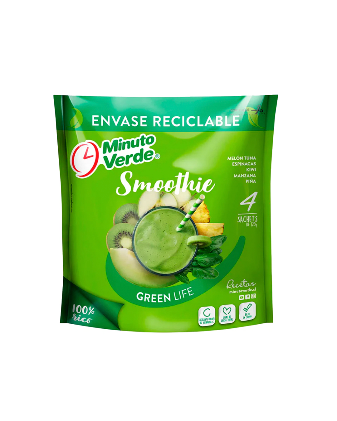 | Preparación | Coloca el producto (1 sachet) en una juguera, agregar 3/4 taza de agua (125ml) y mezclar, hasta obtener la textura que te gusta. así obtendrás un delicioso smoothie green. Si quieres reemplaza el agua por tu ingrediente preferido! leche, yogurt, etc… |